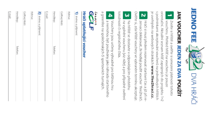 Hráči si zakoupí voucher na hru, a při jeho využití obdrží dvě green fee za cenu jednoho. Kupóny jsou dostupné v balíčcích po 6 kusech, přičemž investice do voucherů se vám vrátí už po první hře. Tento projekt vám umožní navštívit různá golfová hřiště a výrazně ušetřit – až 2000 Kč na jedné hře